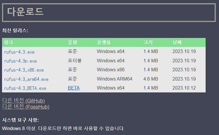 Rufus는 USB 메모리 및 플래시 드라이브를 포맷하고 부팅할 수 있도록 만드는 도구입니다. 이 페이지 아래에 나열된 ISO 이미지 이외에도 Rufus는 여러 종류의 ISO 이미지를 지원합니다. (1) Windows 8 이