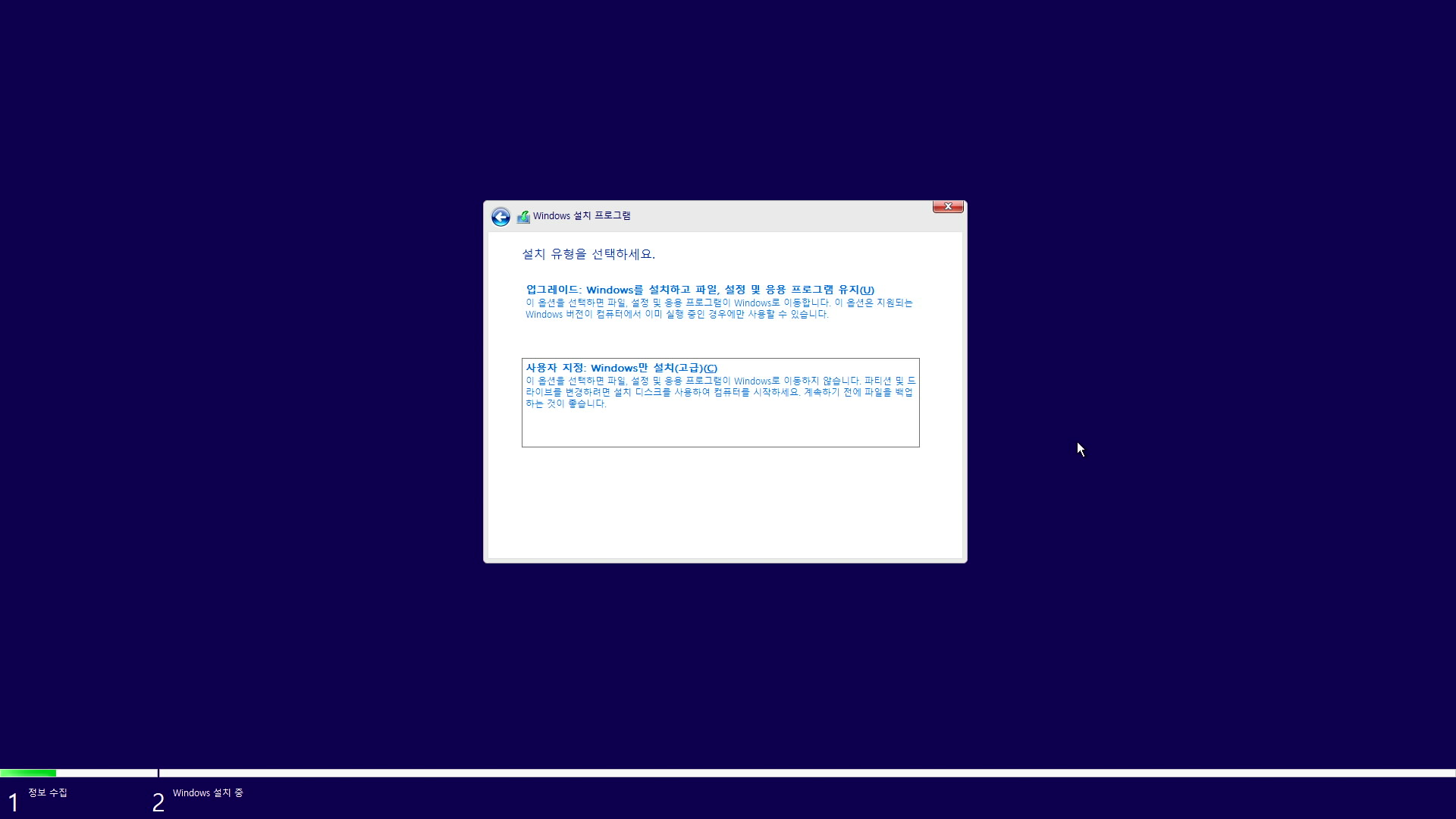 사용자 지정 : Windows만 설치 (고급) <- 을 클릭