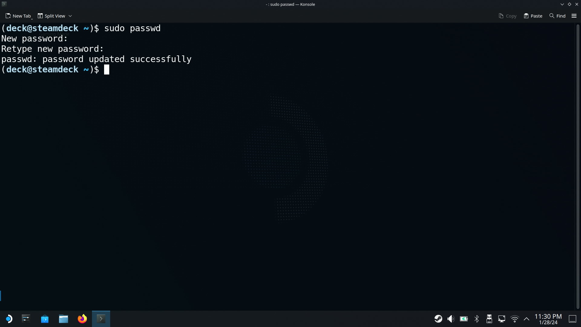 앤터를 누르니 아래 사진처럼 deck@steamdeck 뒤에 추가로 굵은 파란 글씨가 붙습니다.