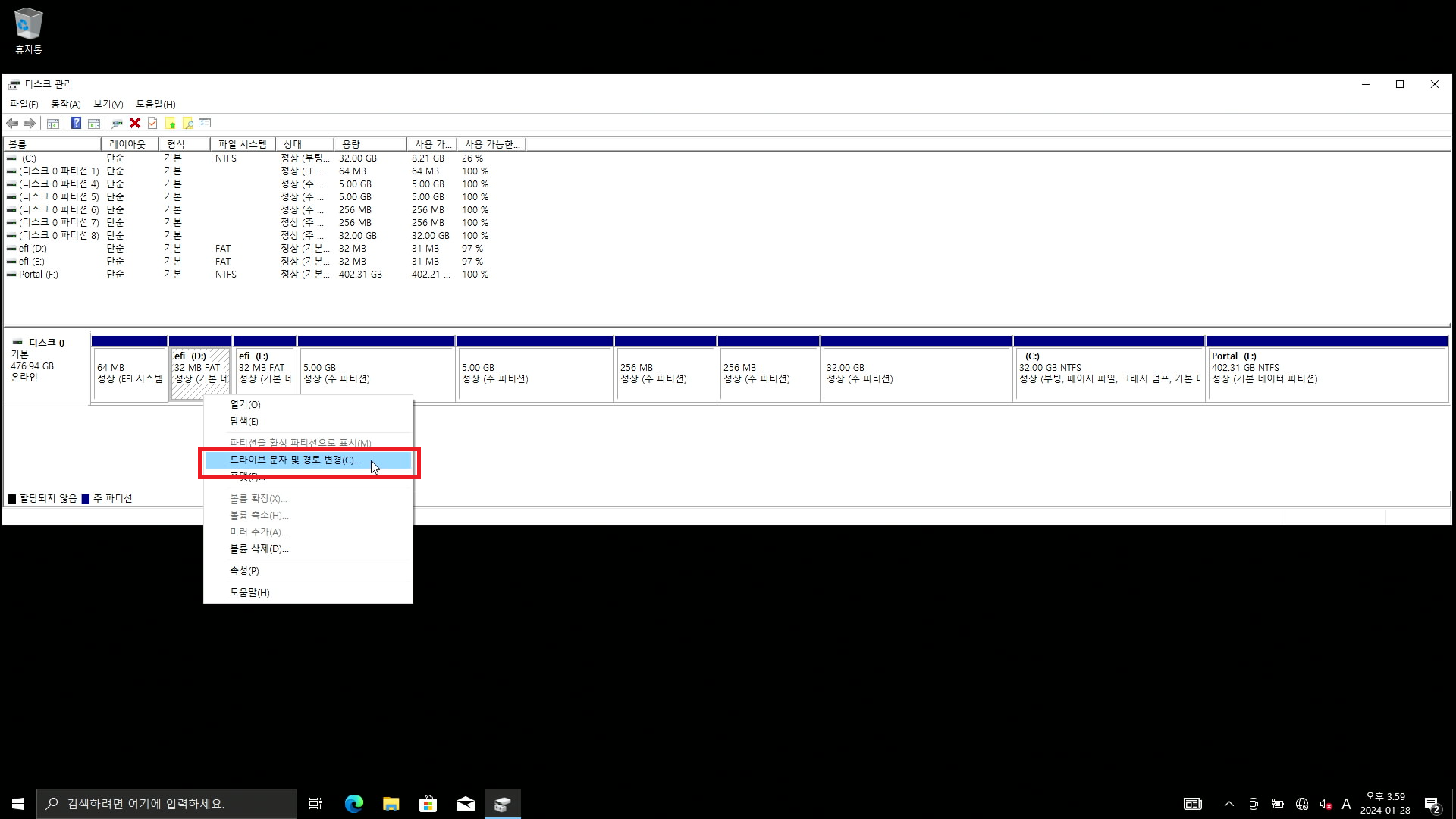 각 드라이브 위에 마우스 커서를 올려두고 우클릭을 해서 드라이브 문자 및 경로 변경을 수행합니다.