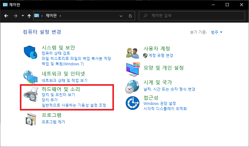 제어판이 켜졌다면 '하드웨어 및 소리'를 클릭합니다.