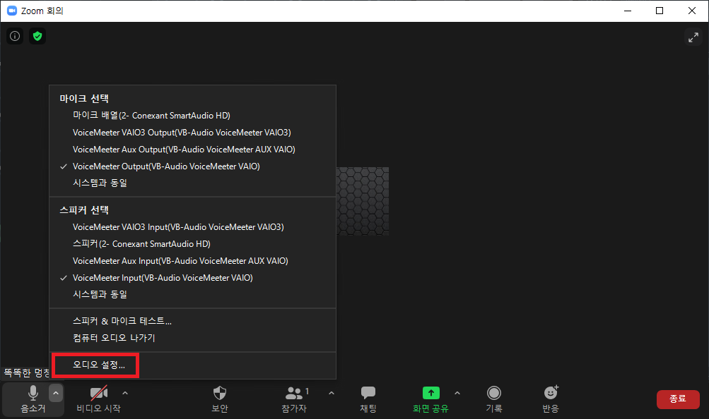 줌에서 보이스미터 마이크를 지정해 주겠습니다.